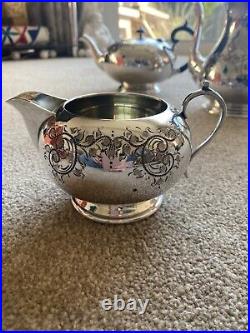 Silver Plated Vintage 4 piece Tea and Coffee Set Made by Cooper Brothers & Sons Mint condition not used. In good vintage condition, this wonderful tea set consists of a tea pot, a coffee pot or a pot for hot water, a milk jug and a sugar bowl. The large jug would also be lovely as a coffee pot. All the pieces stand on four delicate feet. Never been used so in beautiful mint condition and has always been kept in original packaging. Decorated with rococo scrolls, hand engraved details. Hallmarked: Made by Cooper Brothers & Sons Ltd in Sheffield England. Established in 1866 as Cooper Bros by Thomas Cooper and John William Cooper. The firm became Cooper Brothers & Sons Ltd in 1895. Total weight: 2.8kg. Size: Tea pot: 19cm tall. It is 28.5cm by 17cm, 17cm diameter. Coffee pot: 24cm tall. It is 25cm by 14cm, 14cm diameter. Milk Jug: 10cm tall. 16cm by 12cm, 12cm diameter. Sugar Bowl: 14cm tall, 18cm by 12cm. Collection can be arranged if local.